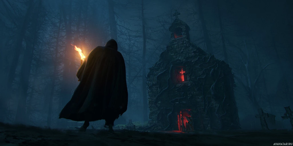 red light coming from it. The overall atmosphere suggests a supernatural or mysterious environment, likely part of a horror or