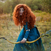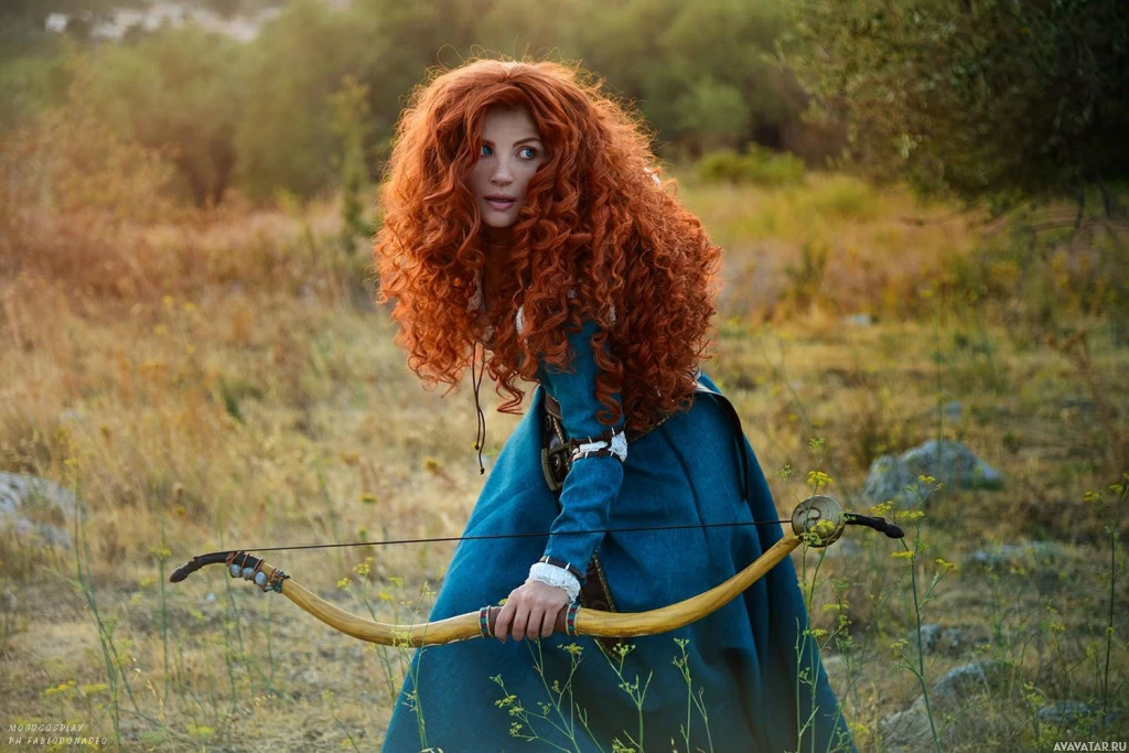 red hair, which is characteristic of Merida's appearance in the film. They are wearing a dress that resembles Merida's outfit and holding a bow and arrow, suggesting they might be portraying her during
