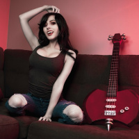 dark hair styled in Marceline's distinctive look and is wearing makeup that enhances the character's features. In front of them on the floor is a red