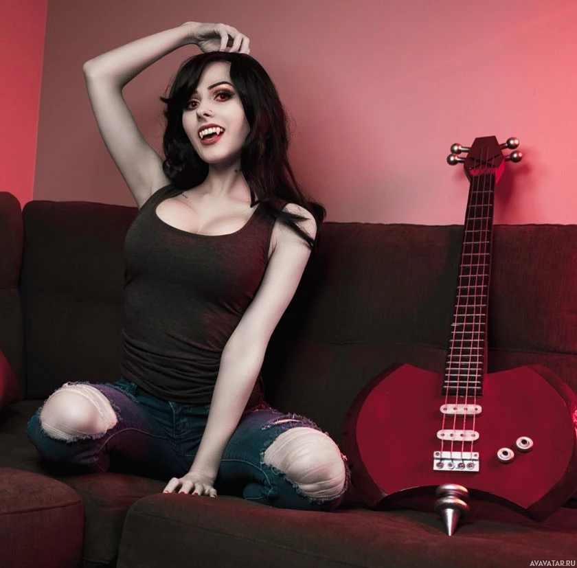 The image features a person dressed as Marceline from the animated television series "