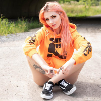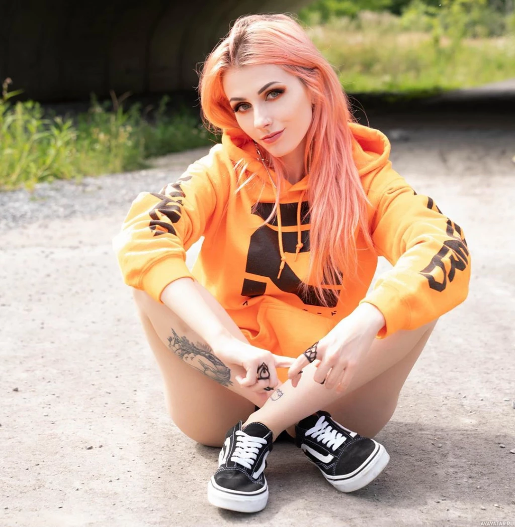 pink hair. They appear to be sitting on the ground, wearing a bright