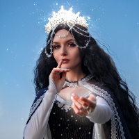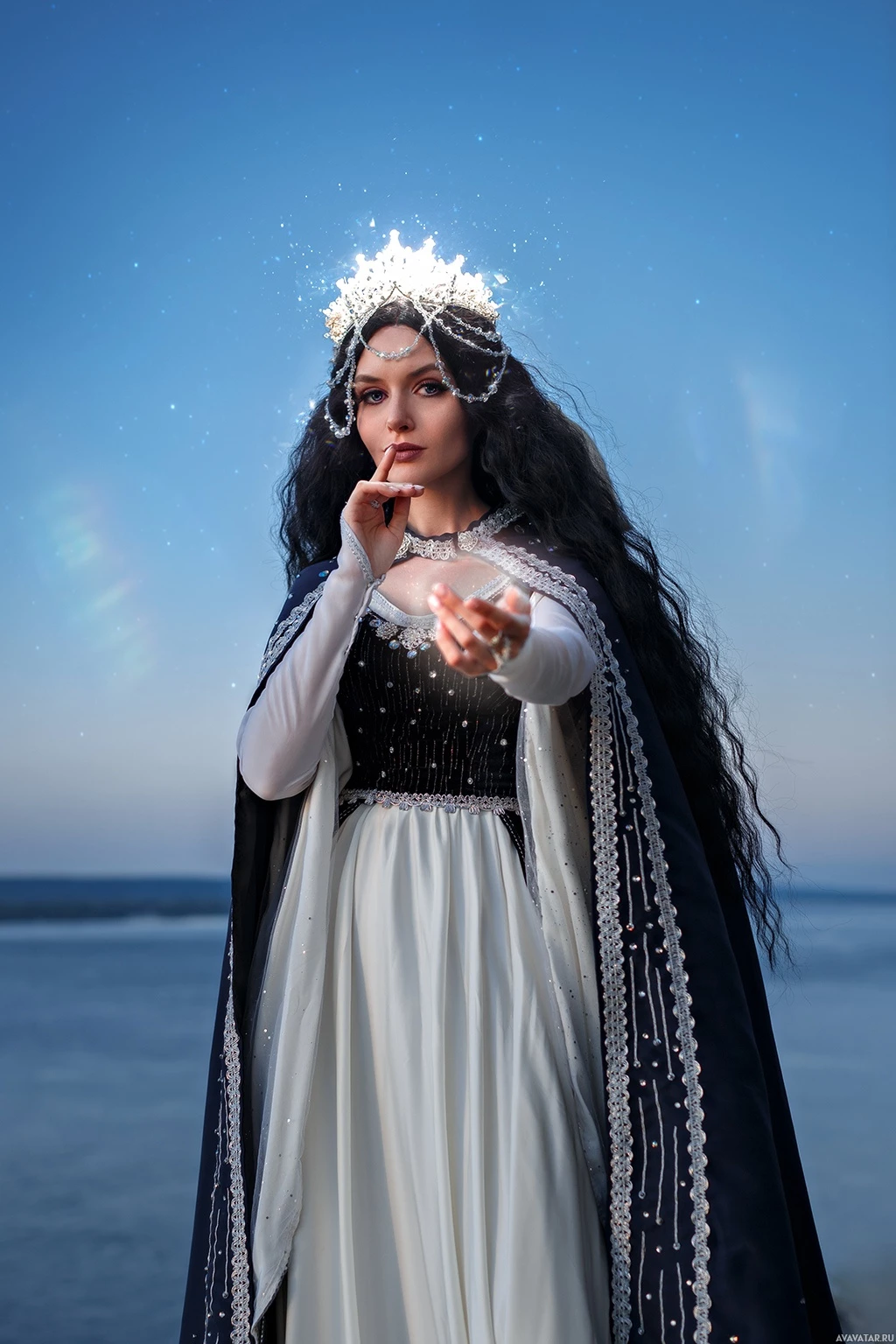 dark hair and is wearing an elaborate dress that seems to be inspired by historical or fantasy attire. On her head, she has a crown-like accessory that adds to her regal appearance. The lighting suggests it might be evening, possibly at sunset or sunrise, giving the image a serene and magical atmosphere.