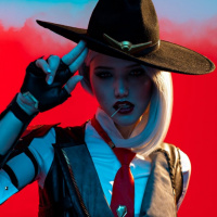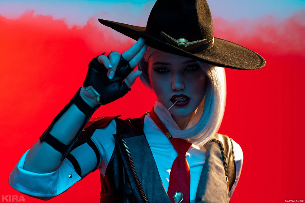 cowboy hat, a red bandana, sunglasses, and a denim-like jacket. Her attire suggests that she is portraying the character, who is known for her