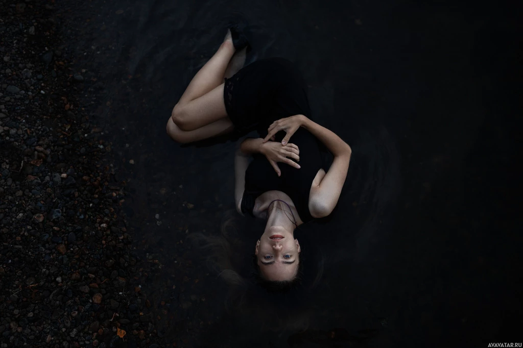 back in water. She appears to be looking upwards and has her hands placed near her body. The image is taken from an angle that captures both her reflection and her upper body above the water's surface, creating a visually interesting duality effect. The woman is described as brunette and is wearing what seems to be