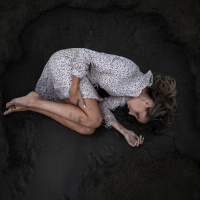 a patterned garment that may be an old-fashioned style of dress. It's not clear from this image alone what the specific context is for this scene, but it could represent various concepts such as stillness, peace, vulnerability, or