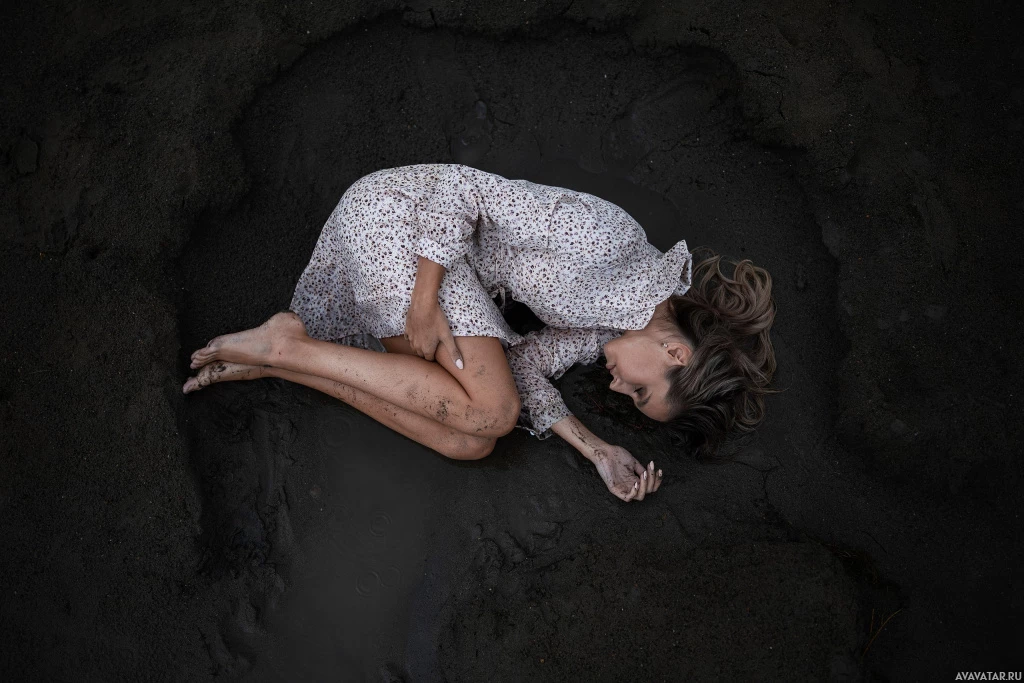 The image shows a woman sitting on the ground with her knees raised to her chest. She appears to be in