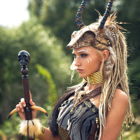 blonde hair and is wearing a costume that includes feathers, a headdress with antlers, and a sword. She's holding the sword in her hand and seems to be posing for the photograph. The setting appears to be outdoors with