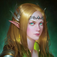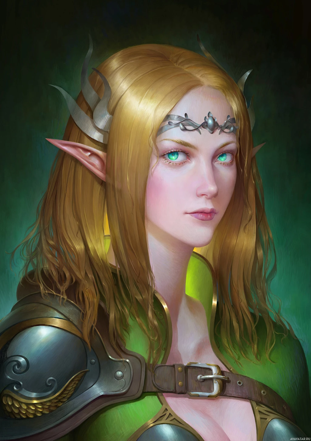 a fantasy setting. The character has pointed ears and is wearing what appears to be armor with a shield-like design on her head. She also has