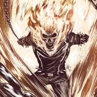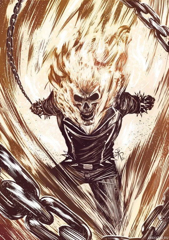 the Marvel Comics' superhero known as Ghost Rider. This character is depicted with flames engulfing his body, which is characteristic of the character's fiery appearance when transformed into the Ghost Rider form. He is also shown wearing