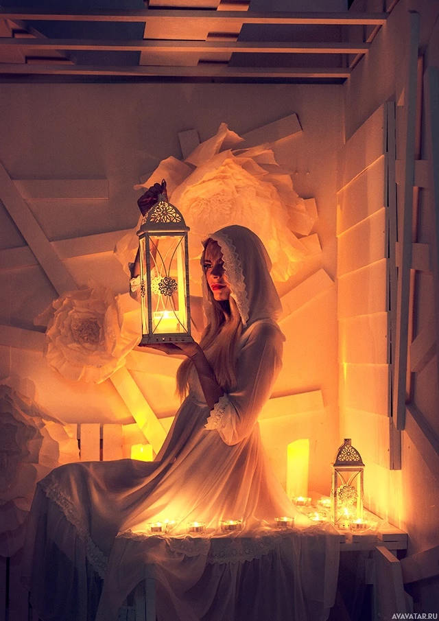 bridal attire. They are holding a lantern with their left hand and appear to be sitting on a structure or platform that is adorned with fabric and decorations. The setting seems to have a cozy, intimate atmosphere, possibly representing