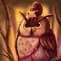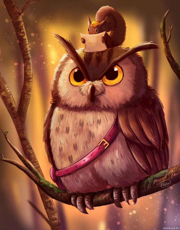 the head of the owl, giving an amusing and slightly surreal impression. Both animals are depicted in a cartoonish style with exaggerated features, such as