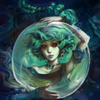 The image shows a stylized illustration of a girl with turquoise hair. She has an underwater theme, as suggested by the bubble she's inside and the flowing hair that could be interpreted as seaweed. The background is dark and moody, fitting the aquatic atmosphere.
