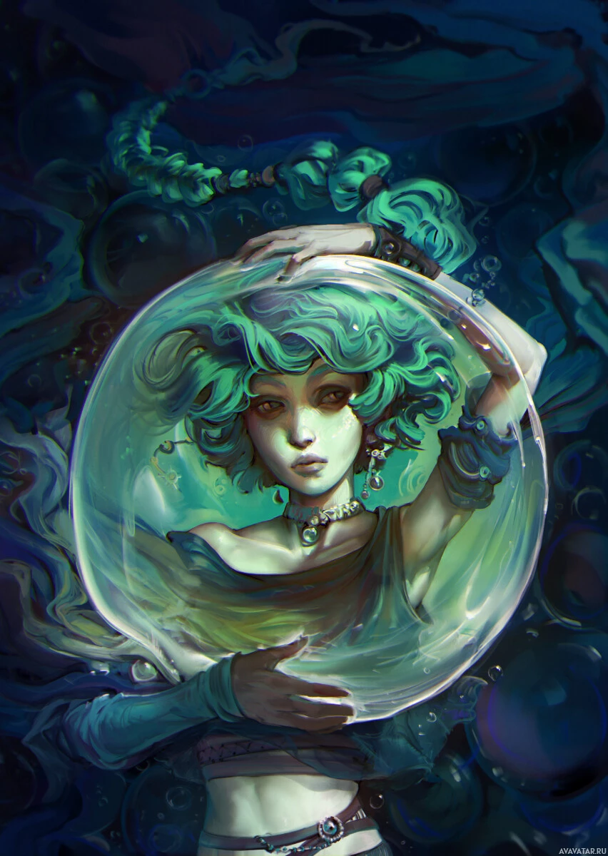 На картинке изображена стилизованная иллюстрация девушки с бирюзовыми волосами. У нее подводная тематика, о чем свидетельствует пузырь, внутри которого она находится, и развевающиеся волосы, которые можно интерпретировать как водоросли. Фон темный и мрачный, что соответствует водной атмосфере.