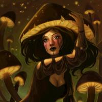 a black dress with lace detailing on the neckline. The background consists of various mushrooms in shades of green and brown, suggesting an underground or