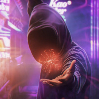 hooded cloak and the setting appears to be indoors with an ambient glow that could suggest some form of energy or magic is being emanated from the individual's hand. The background is blurred, which adds to the mystical and fantastical atmosphere of the scene.