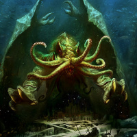 fantasy scene with a prominent figure that appears to be a mythical creature, possibly inspired by the Cthulhu mythos. This character is a large octopus-like being with tentacles and a humanoid form, standing on what looks like a rock formation or reef within