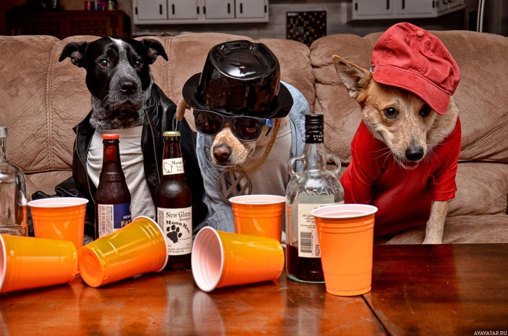 a kitchen table with cups and bottles that may contain beverages. One dog is wearing a bandana on its head, another has sunglasses on, and