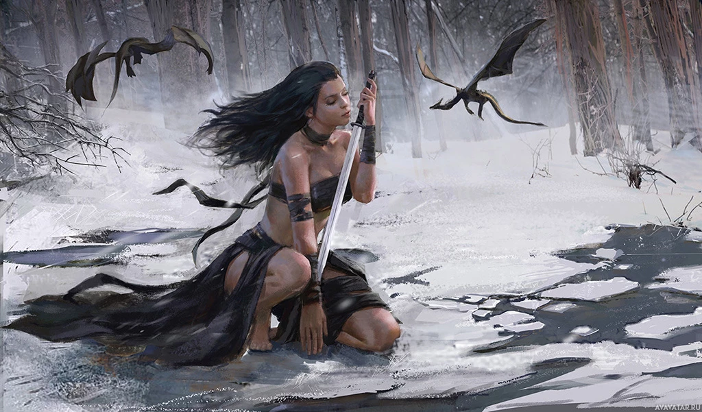 a young woman in a fantasy setting. She is seated on the ground, knee-deep in water that reflects her figure. Her hair is windblown, suggesting movement or a breeze. She is dressed in attire that appears to be inspired by ancient or tribal styles, with elements like a leather or skin garment and what looks like a loincloth. In one hand, she holds a sword which rests on the ground beside her. There are several