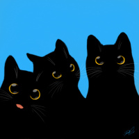 The image shows three black cats with yellow eyes against a blue background. They appear to be looking at something or someone, and their expressions seem attentive and curious. The style of the artwork is cartoonish and whimsical, emphasizing the cute and endearing features of these feline characters.