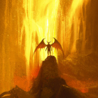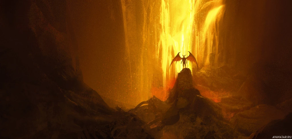 a fantasy scene featuring what appears to be a demonic figure or entity. It's set in an underground lava-
