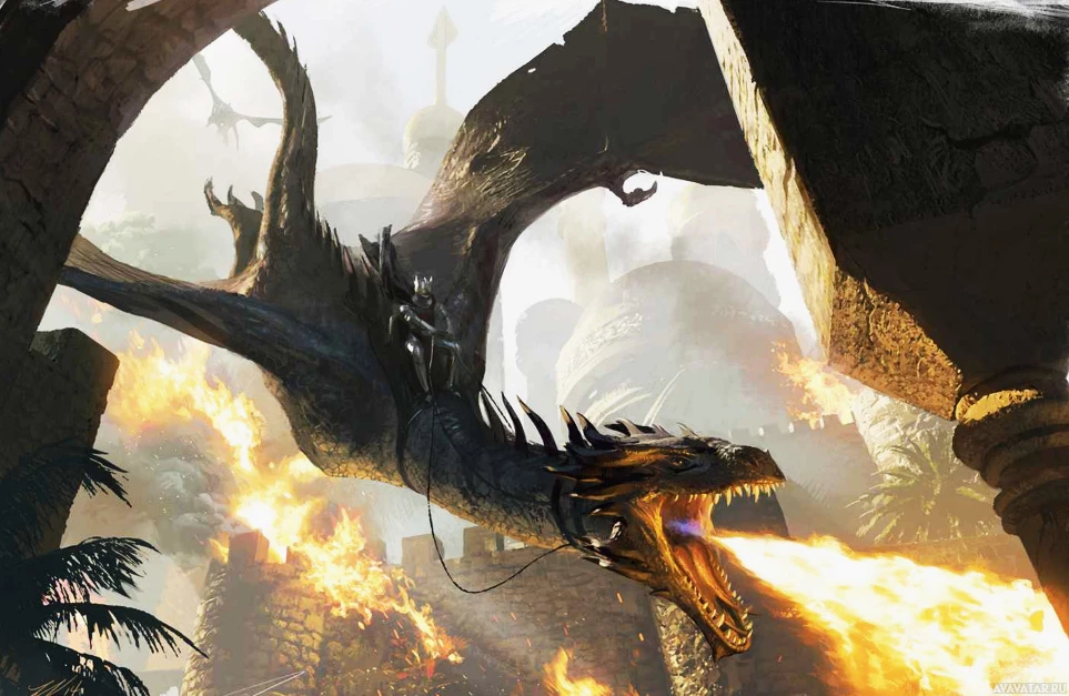 video game, featuring a dragon surrounded by flames and destruction. There is a character riding