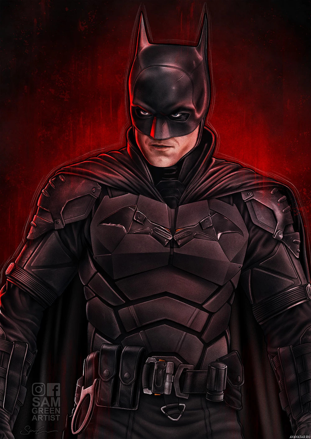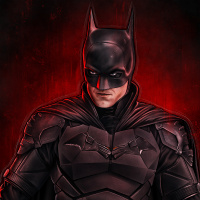 iconic costume, which typically consists of a cowl, cape, emblem on the chest, and a utility belt with various gadgets. The background appears to be designed to highlight the character's dark theme, with red elements that give it