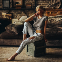 casual attire consisting of a graphic T-shirt and high-waisted pants. Their pose is relaxed yet poised, suggesting