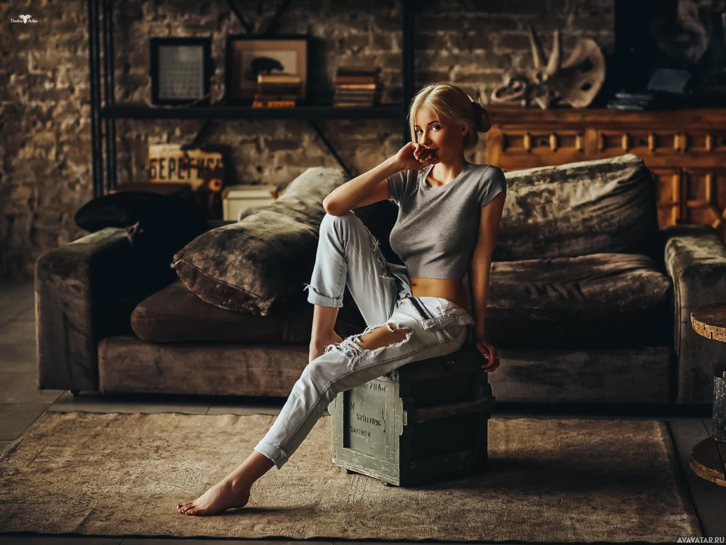 wooden chest, with their legs crossed and one hand resting on their thigh. They are wearing