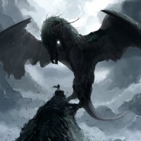 an aggressive posture, with its wings spread wide and its head turned towards a smaller figure at the bottom of the image. The smaller figure seems to be either facing off against or bowing before the dragon. The background is dramatic, with
