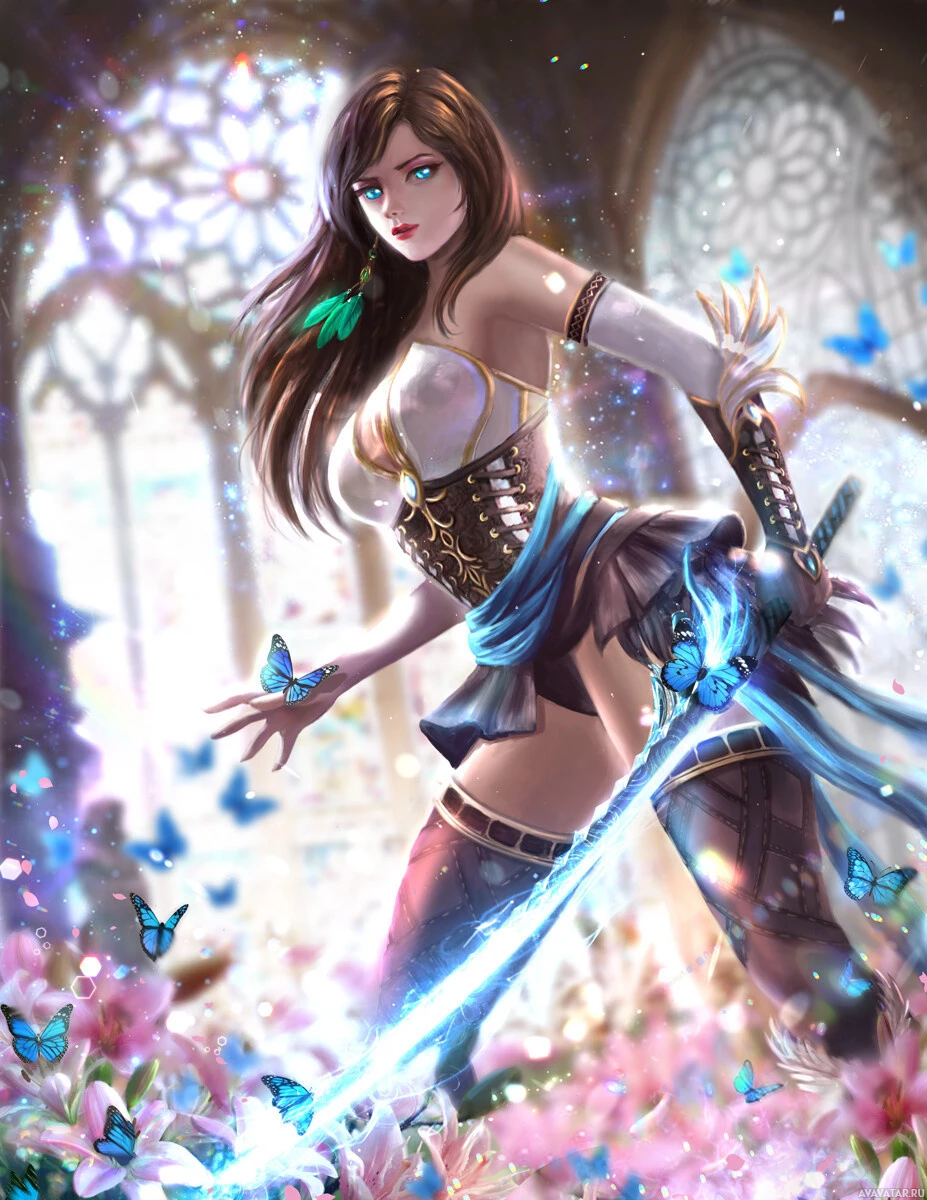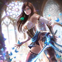 a female character, who appears to be a fantasy or video game-inspired figure. She has long