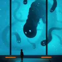The image depicts a person standing in front of a large window that overlooks a vast body of water. Inside the water, there appears to be an underwater monster or creature, which seems menacing and is likely the silhouette referred to. The overall atmosphere suggests a scene from a science fiction or fantasy setting.
