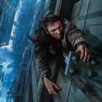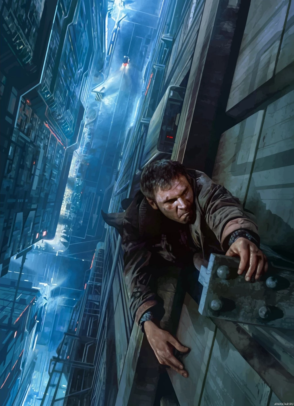a science fiction story. The man is holding onto a pipe or railing, indicating that he might be in the middle of some sort of pursuit or escape.