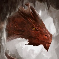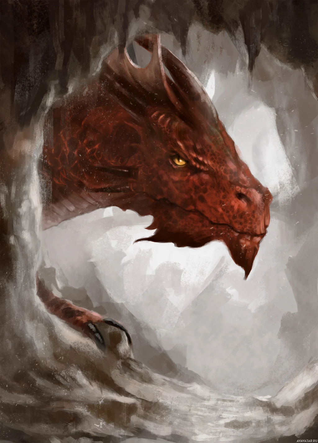 The image shows a fantasy-themed illustration of a dragon. It appears to be an artistic representation rather than a photograph, given the stylized nature and the way it is drawn. The dragon has a prominent role in the picture, with its head emerging from what seems to be a cave or