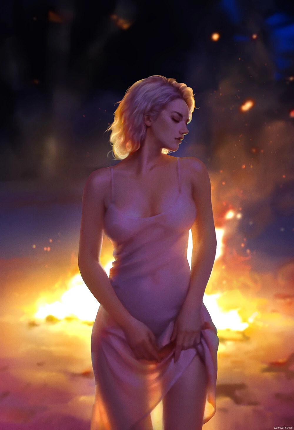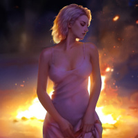На картинке изображен персонаж женского пола с белыми волосами и закрытыми глазами. Кажется, что она стоит на огненном фоне, что может свидетельствовать о том, что она находится в опасной или конфликтной ситуации. Поза персонажа и окружающие элементы создают атмосферу напряженности и драматизма. Важно отметить, что это описание основано на приведенных ключевых словах и не содержит какого-либо спекулятивного или вымышленного содержания.