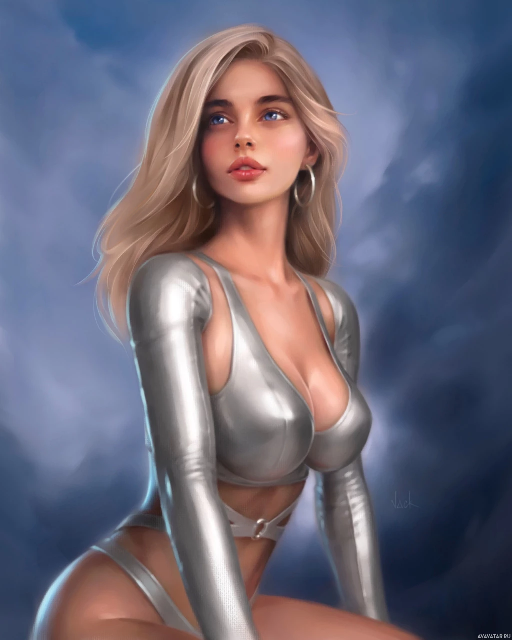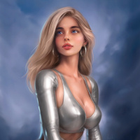 full lips and her gaze directed off to the side. The woman is wearing what appears to be a metallic or futuristic-looking outfit that resembles a silver bodysuit, complete with straps and detailing on