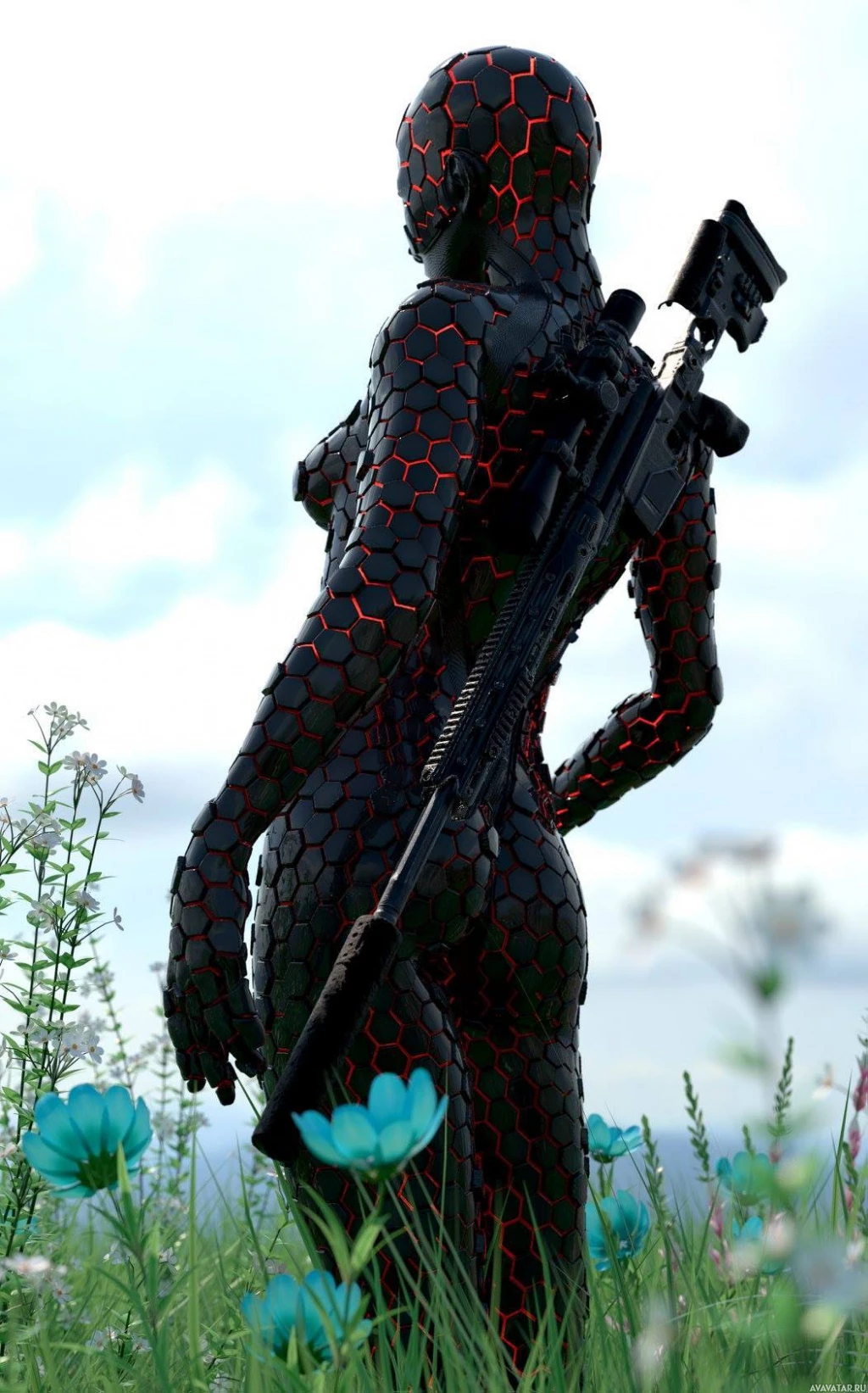 advanced technology, including what looks like a gun mounted on its right arm. The background suggests an environment where nature meets advanced technology, which is consistent with