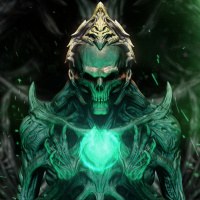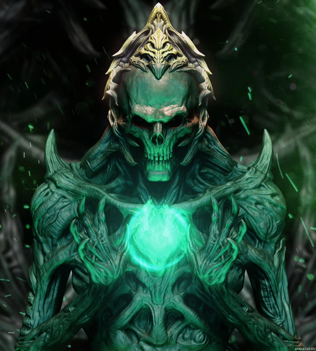 a skeletal structure. It appears to have some sort of magical or mystical energy emanating from its hands, as indicated by the glowing green elements. The creature's skin also seems to be made up of
