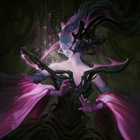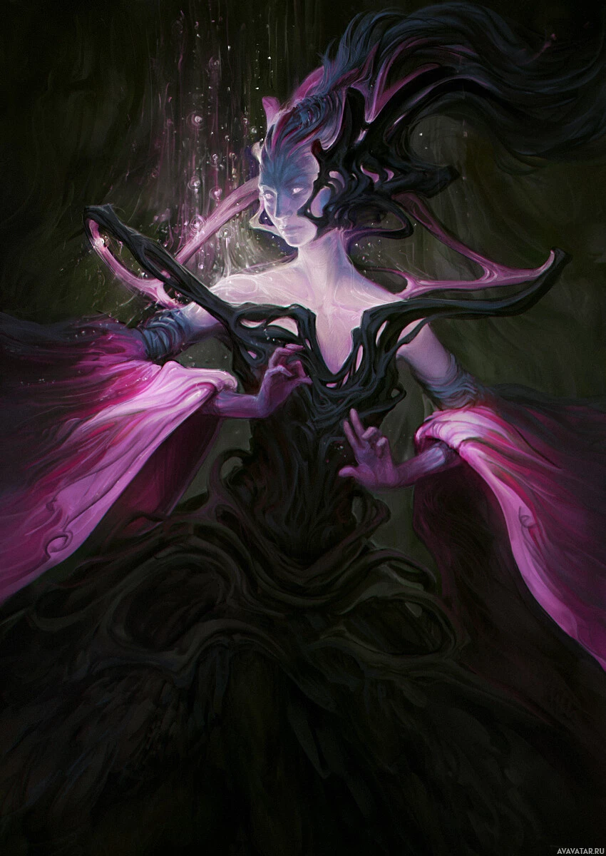 an eerie ambiance with its dark color palette and mysterious elements. The overall mood of the piece suggests a narrative of power or transformation within