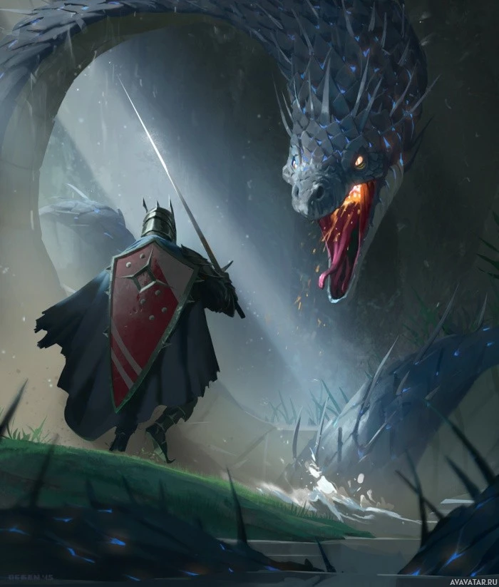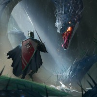a dark forest with misty conditions, which could suggest a battle between good (the warrior) and evil (the dragon). The overall atmosphere of the image conveys