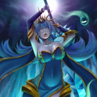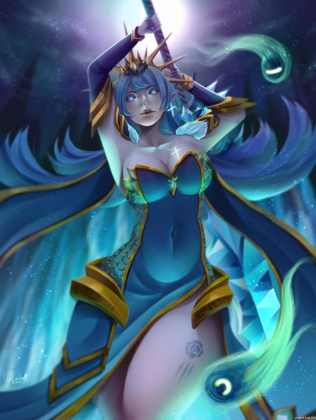 На картинке изображен анимационный персонаж, который выглядит как волшебное существо или ведьма с голубыми волосами. Она одета в мистический наряд и окружена магическими элементами, такими как кристаллы и световые эффекты, которые предполагают, что она контролирует стихии или магию. Ее поза наводит на мысль, что она, возможно, произносит заклинание. Общий стиль изображения - фэнтезийный, с темным фоном, который усиливает мистическую атмосферу.