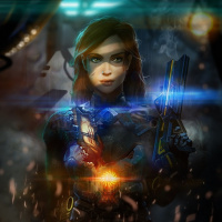 a female character in a science fiction setting. The character appears to be wearing futuristic armor and holding a weapon that resembles a gun or blaster, which are common elements in