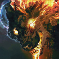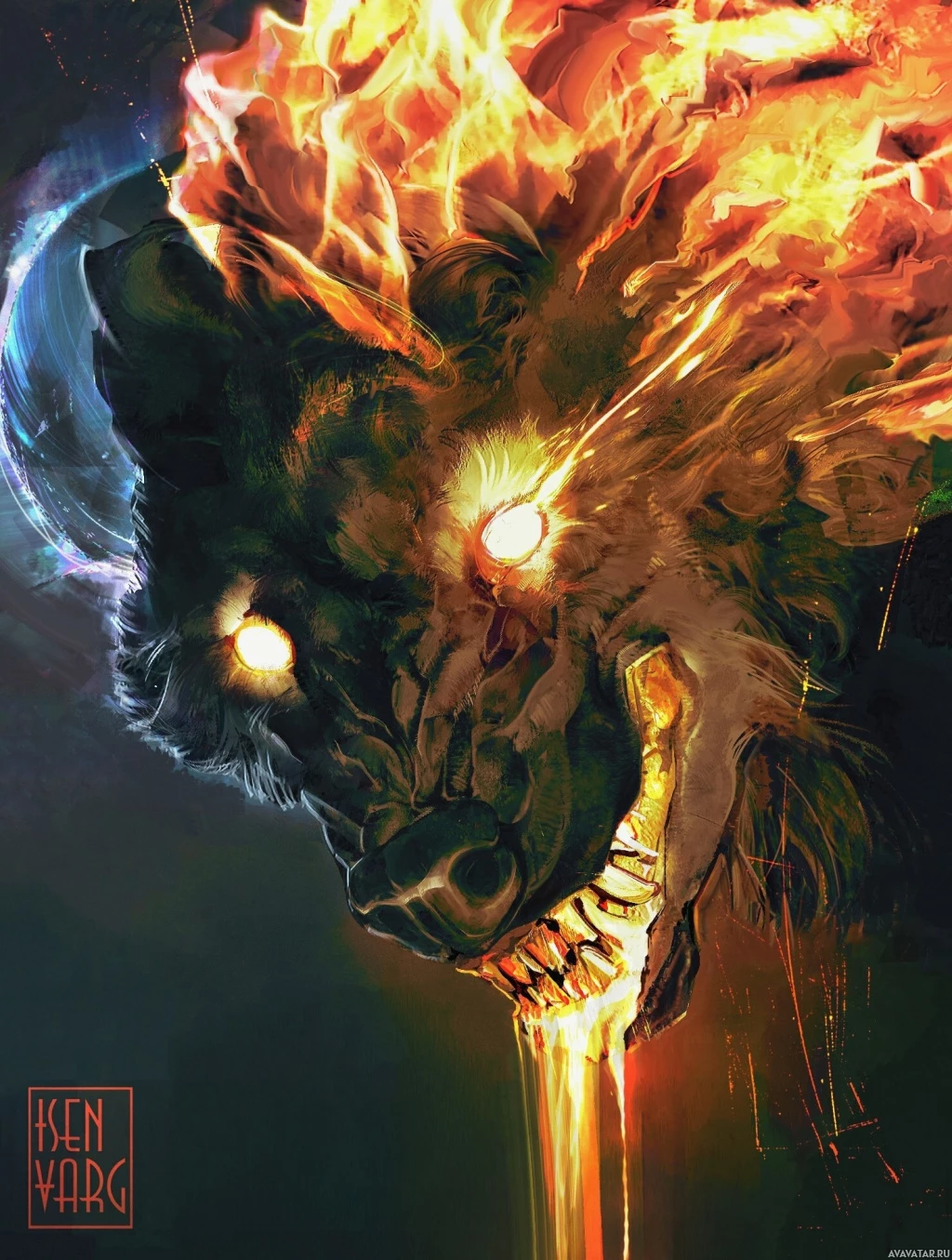 the brightness of the flames. This artwork can be associated with themes like fantasy, fire, and the wolf as