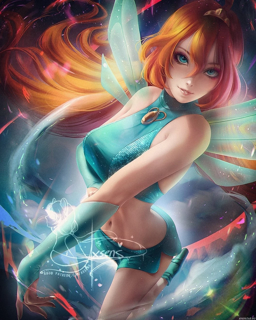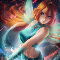 red hair and is depicted with fairy-like features such as wings, which suggest she might be a fairy. She's wearing what appears to be a magical or mystical outfit, including armor and a cape that could indicate some