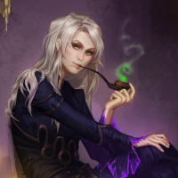a warm glow. In her hand, she holds what looks like a pipe, suggesting a relaxed or contemplative pose. The overall atmosphere of the image is one of mystery and elegance.