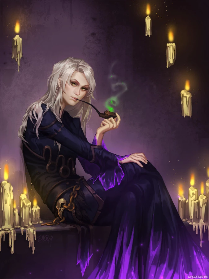 a female character with white hair and a black dress. She is seated in what appears to be an old-fashioned or gothic setting, surrounded by candles on the walls that emit