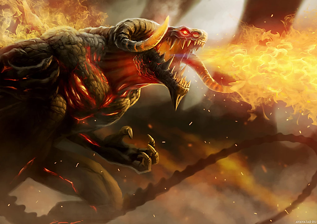 fiery ambiance, which enhances the menacing feel of the image. The creature's pose and expression give it a formidable appearance, fitting for a fantasy setting where such beings are often portrayed as powerful and fearsome.