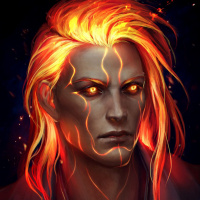 a fantasy character who appears to be a male with red hair and striking yellow eyes. He has