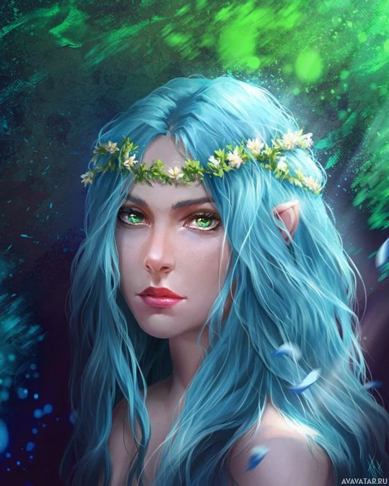 a floral crown or headband, which adds to the fantasy element of her appearance. The background has a mystical or enchanted feel, with swirling patterns and