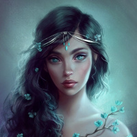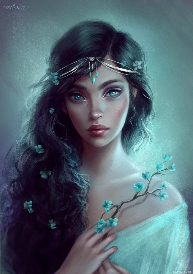 blue flowers. The artwork conveys a sense of fantasy or otherworldliness, possibly suggesting a character from