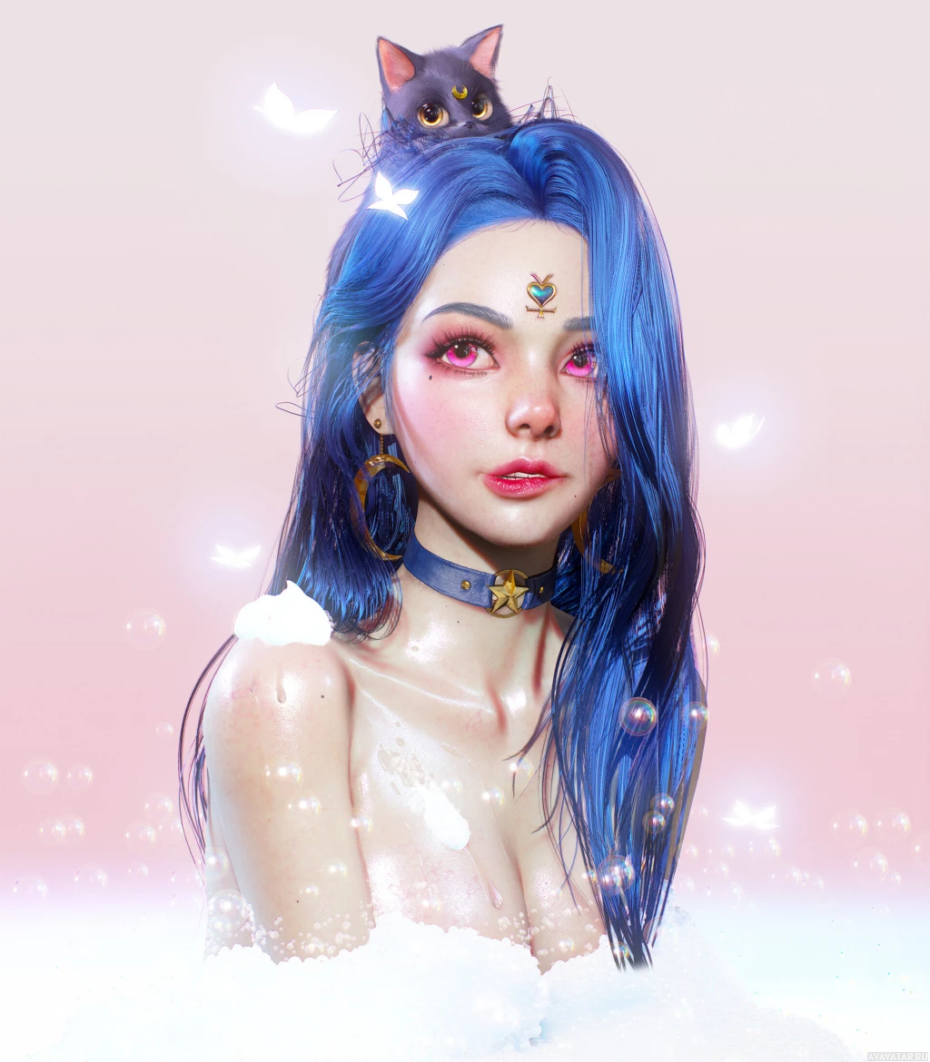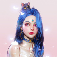 large cat-like ears on her head and is wearing what appears to be a necklace or choker around her neck. Her eyes are pink, and she has a small,